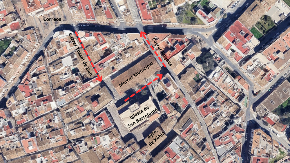 As a result, vehicular access to the Municipal Market, Farmacia Espinós, the Plaza de la Iglèsia and the Ayuntamiento de Xàbia will be via Carrer Tossal de Dalt (opposite the post office square) and exit will be via Carrer Roques towards Ronda Nord, the opposite direction to the normal flow of traffic.