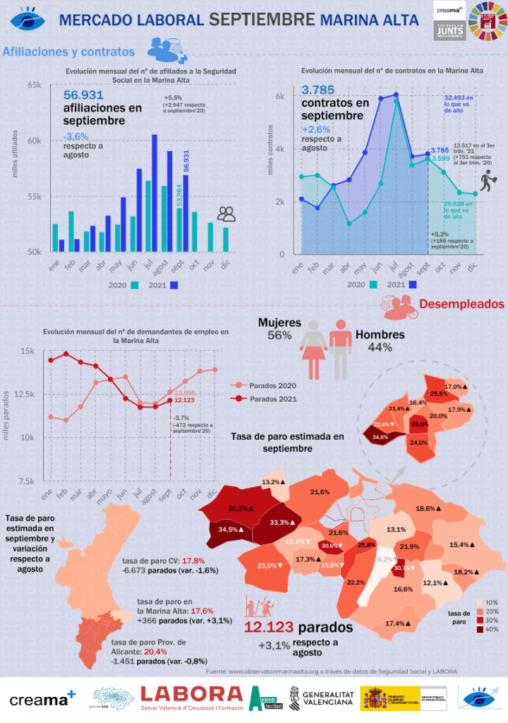 CREAMA has analyzed the employment data of the Marina Alta for September, revealing an uneven (but habitual) behaviour in each of the productive sectors. While some have slowed down after the intense summer season, others are picking up the pace after the holiday break. The interesting thing is to see if progress is being made towards an economic recovery or, on the contrary, there is a slowdown in economic growth typical of the autumn and winter months.