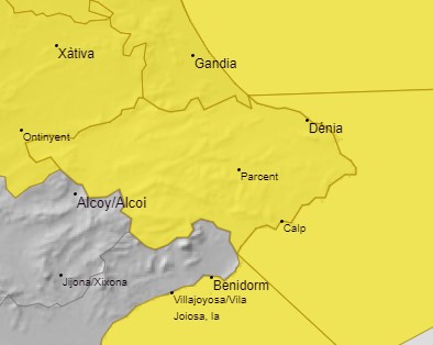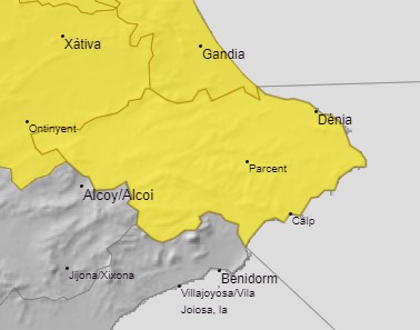 The state meteorological agency AEMET has activated a YELLOW alert risk warning for the potential for heavy rain and strong winds from midday tomorrow Wednesday 13th April which could affect many places throughout the Marina Alta region until the early evening of Thursday 14th April.