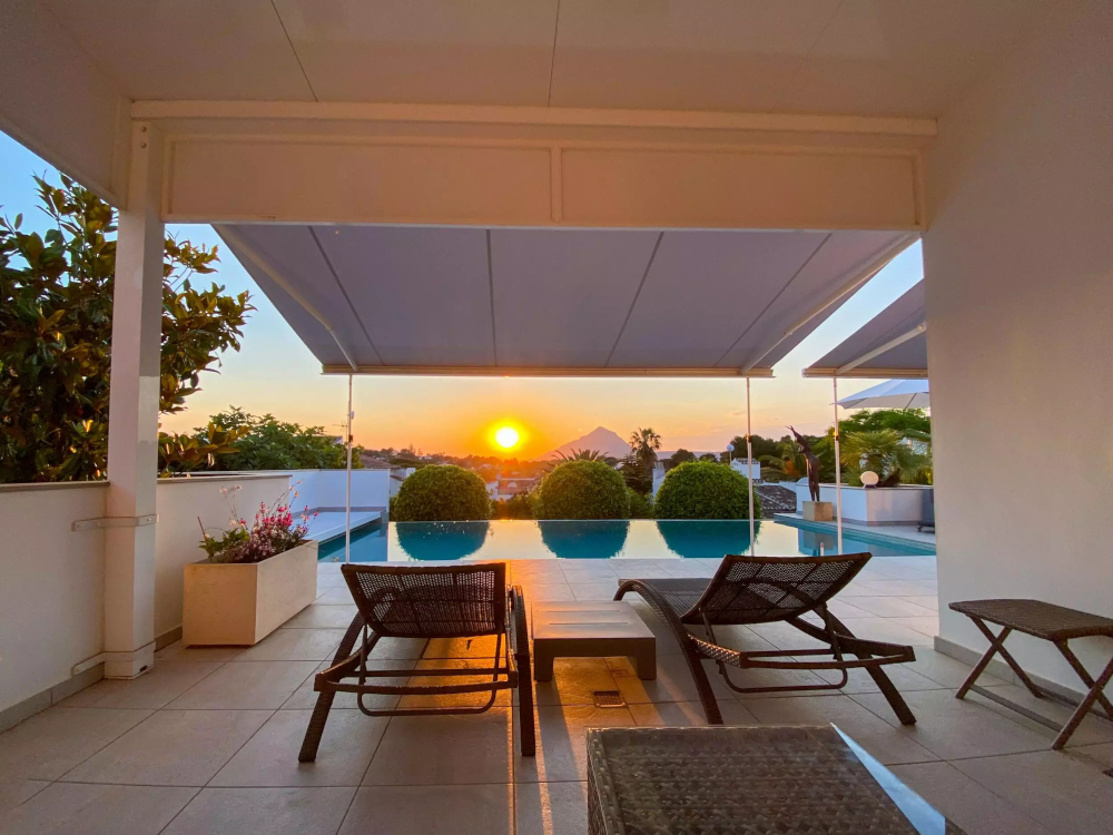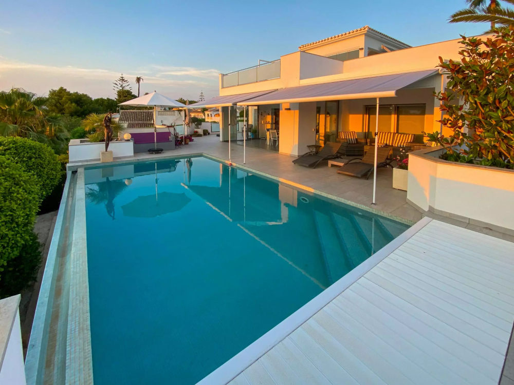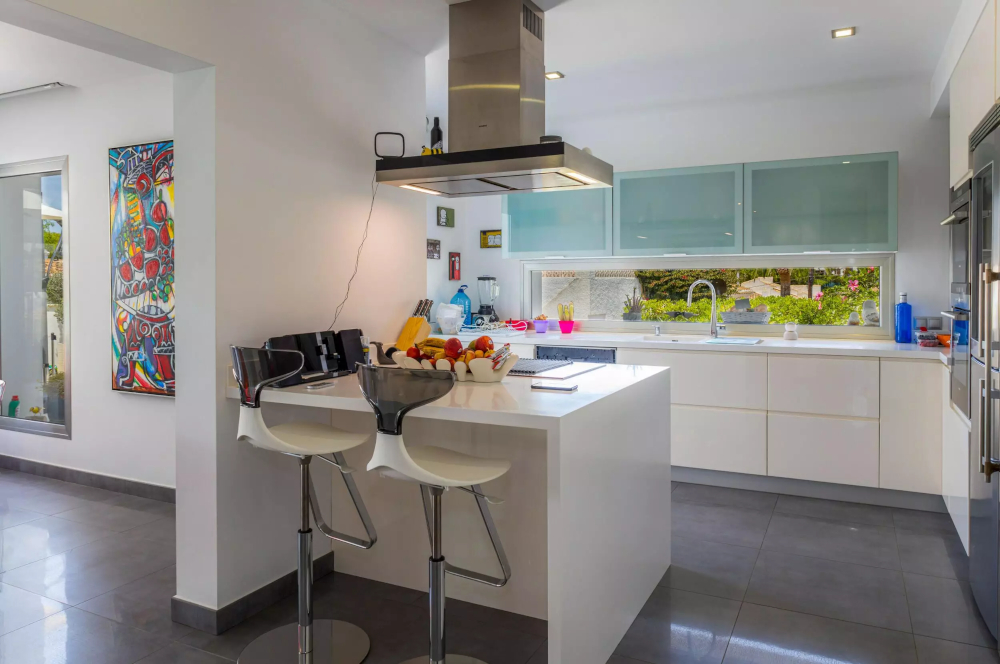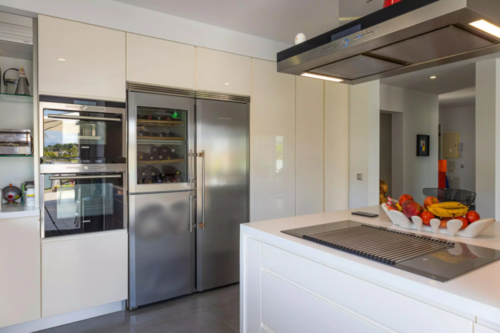 The property has an open concept living area with modern fitted kitchen and a bright and sunny glazed in dining area with plenty of room for dining and to relax overlooking the infinity swimming pool and the mountain of Montgó in the distance.