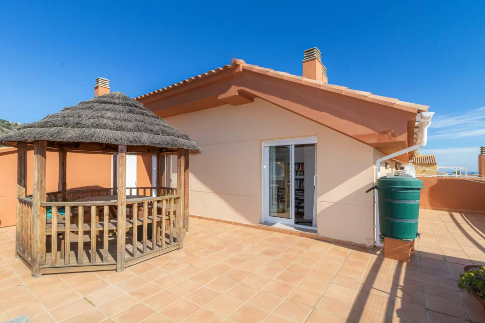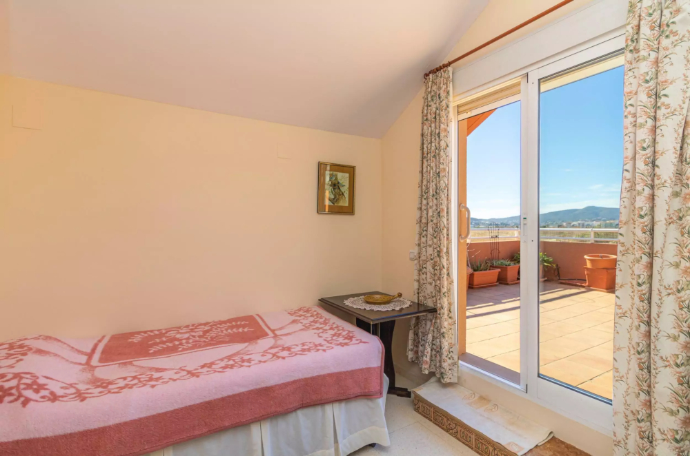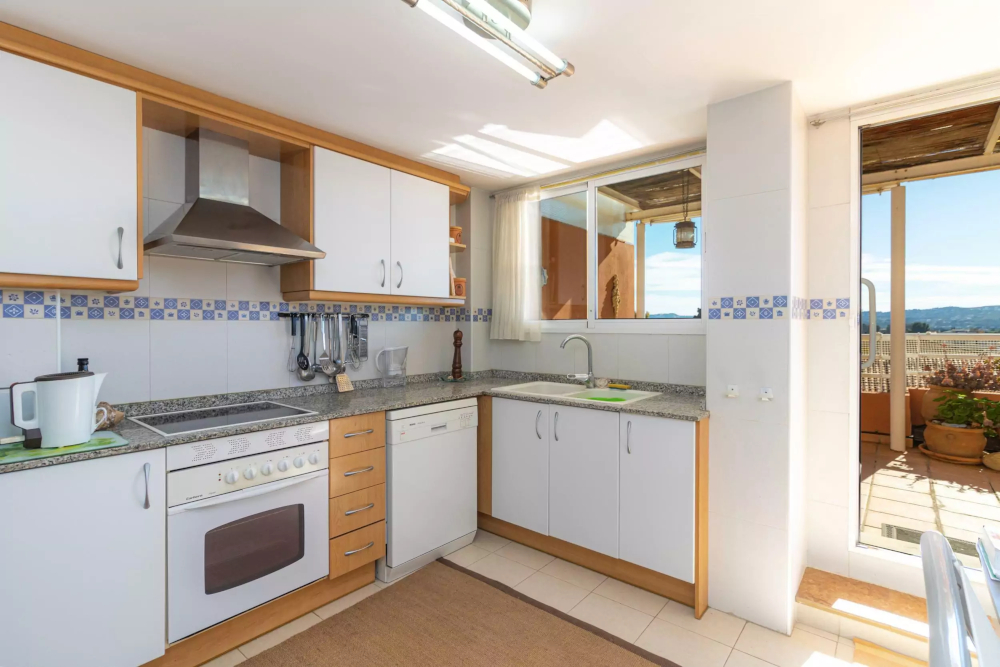 This duplex penthouse with sea view for sale in Javea has 3 bedrooms and 3 bathrooms distributed over two floors. Also a large living / dining room with access to a covered terrace. At the top you have a large outdoor terrace perfect for sunbathing with total privacy.