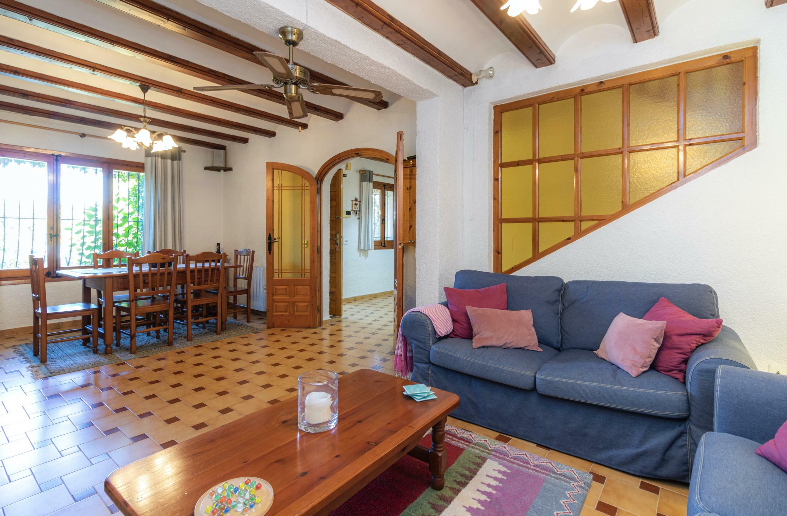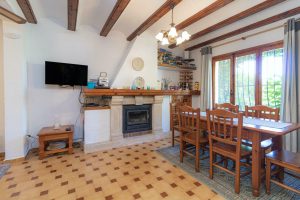To your right is the living and dining área with plenty of room for at least six people to dine comfortably or relax and cool off from the hot summer sun. The ceiling has traditional wooden beams and the log burner with its natural stone trim is an ideal spot to cuddle up during the cooler winter months, with the fire roaring and a good film playing.