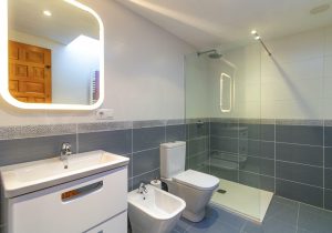 To the left is the ground floor air-conditioned bedroom with its built-in wardrobe and en-suite shower room complete with WC and bidet.