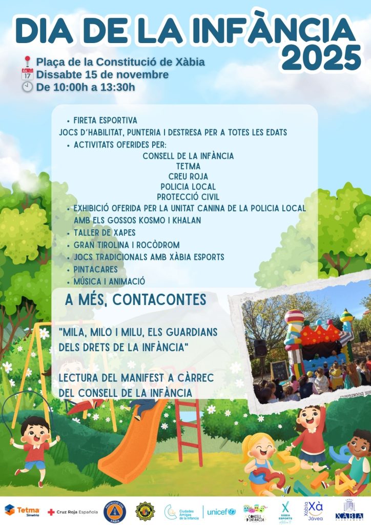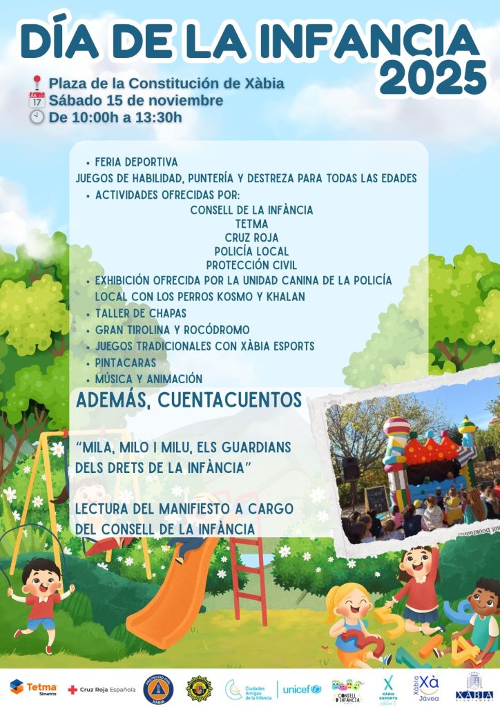 The Ayuntamiento de Xàbia, through the Consell de la Infància and with the collaboration of various local organizations, will celebrate Children’s Day 2025 on Saturday 15th November in the Plaza de la Constitución. The event will run from 10.00am to 1.30pm, offering a lively programme of free activities for children and families.