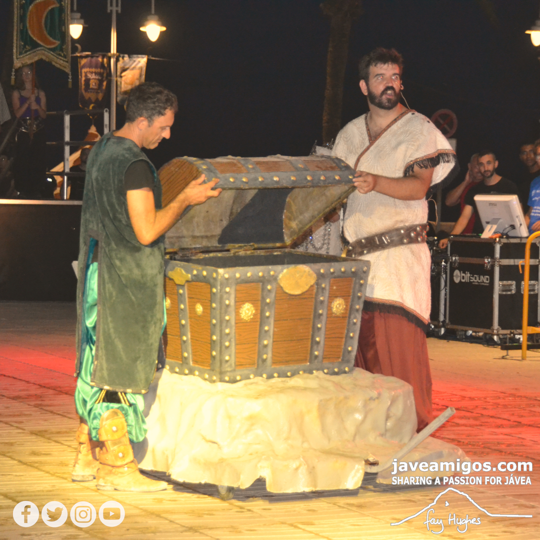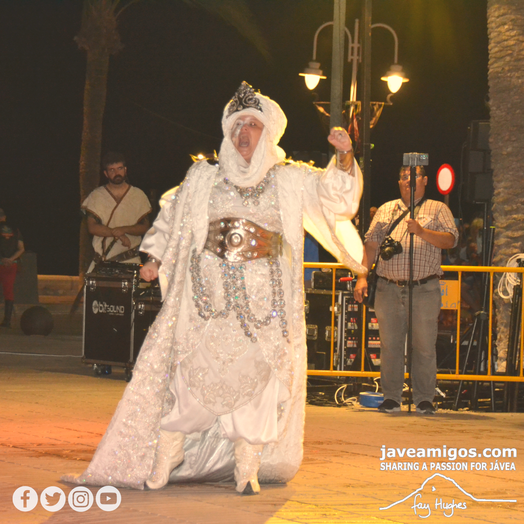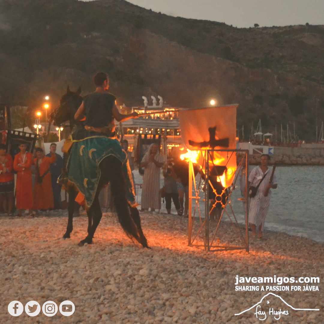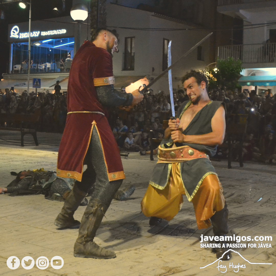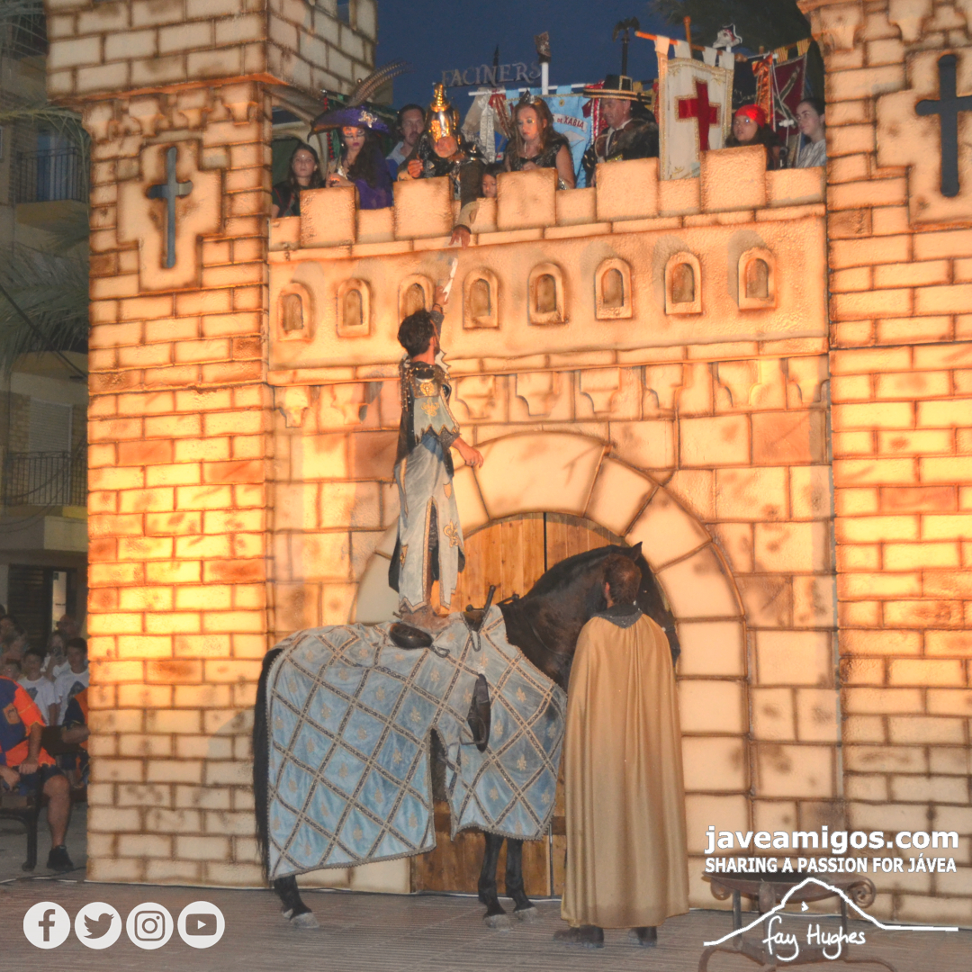 An exchange of fire marked the symbolic takeover of the beach, led by a horseman who snatched flags of the cross and burned them on the flaming torches. As the Moorish filaes pushed their Christian counterparts back towards the castle erected on the square in the middle of Avenida Jaime I, the gunfire accelerated as the Moorish ambassador arrived to arrange the surrender of the fortress. Soldiers battled each other on the square, the sparks flying from the blades in the falling darkness. An offer of jewels and precious stones was turned down; the tantalising dancing from a lone woman ignored.
