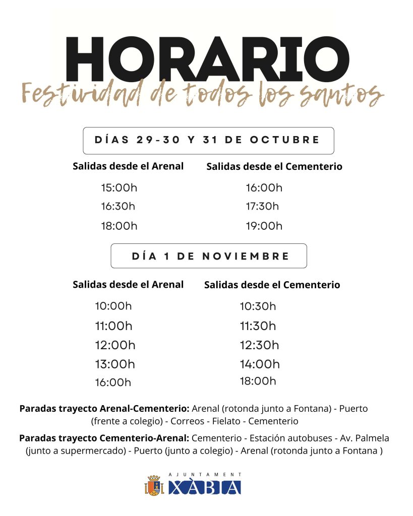 The service will operate on 29, 30, and 31 October, and 1 November, with routes running between Arenal and the cemetery at various times throughout the day.
