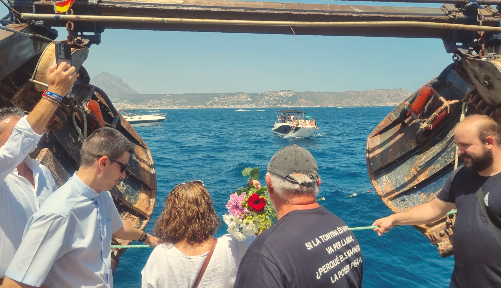 Accompanied by two other fishing boats, the Rio Oja Guardia Civil patrol boat and several other recreatiinal vessels, it headed to Cala Sardinera where the fishermen made an offering to the people who have been lost at sea.